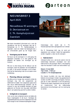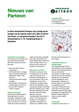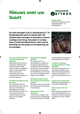 De D. Doniastraat en C.Th. Kamphuijsstraat vormen een gezellig buurtje. Parteon heeft er 45 eengezinswoningen. Bewoners hadden hier onder andere last van verzakkingen, vocht en tocht in hun woning en de stookkosten zijn erg hoog. Uit onderzoek bleek dat de fundering en het casco bij de meeste woningen in slechte staat waren. Kortom: het was tijd voor een grondige aanpak. We kozen voor sloop en nieuwbouw. Zo kunnen we energiezuinige woningen bouwen met goede geluidsisolatie en een hoog wooncomfort. De woningen gaan dan nog lang mee. De meeste huidige bewoners hebben het naar hun zin in de buurt en mogen terugkeren naar de nieuwbouw als ze dat willen.