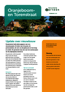 Aan de Oranjeboomstraat en Torenstraat 8-22 in Westzaan Noord staan zes blokjes met in totaal 24 eengezinswoningen in een groene setting. 22 woningen zijn sociale huurwoningen in eigendom van Parteon en 2 woningen zijn eigendom van particulieren. Het laatste blokje aan de Oranjeboomstraat ligt aan het water.