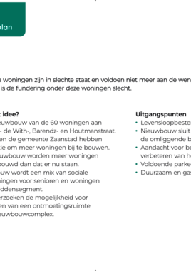 Onze woningen aan de Witte de Withstraat, de Barendszstraat en de Houtmanstraat in Wormerveer Noord hebben problemen met de fundering. Daarom werken wij aan een nieuwe buurt. Nu staan er 60 woningen boven en beneden elkaar. Deze woningen zijn in 1956 gebouwd. Wij willen deze oude woningen slopen en nieuwe woningen bouwen. Er komen ook meer woningen bij.