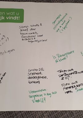Wij hebben verschillende bijeenkomsten gehouden. Bewoners en buurtbewoners konden komen kijken en vragen stellen. Ze konden informatie lezen en praten met ons projectteam, de gemeente, de energiecoach, het wijkteam en de bewonerscommissie. Bewoners konden ook vragen stellen over het sociaal plan. Iedereen kon ideeën geven over de buurt en veiligheid. We wilden weten wat bewoners goed en niet goed vinden aan hun huidige woning. Dit konden ze opschrijven op papier. Foto's van deze papieren staan onderaan deze webpagina. Ook kunt u de informatieborden daar nog een keer bekijken.